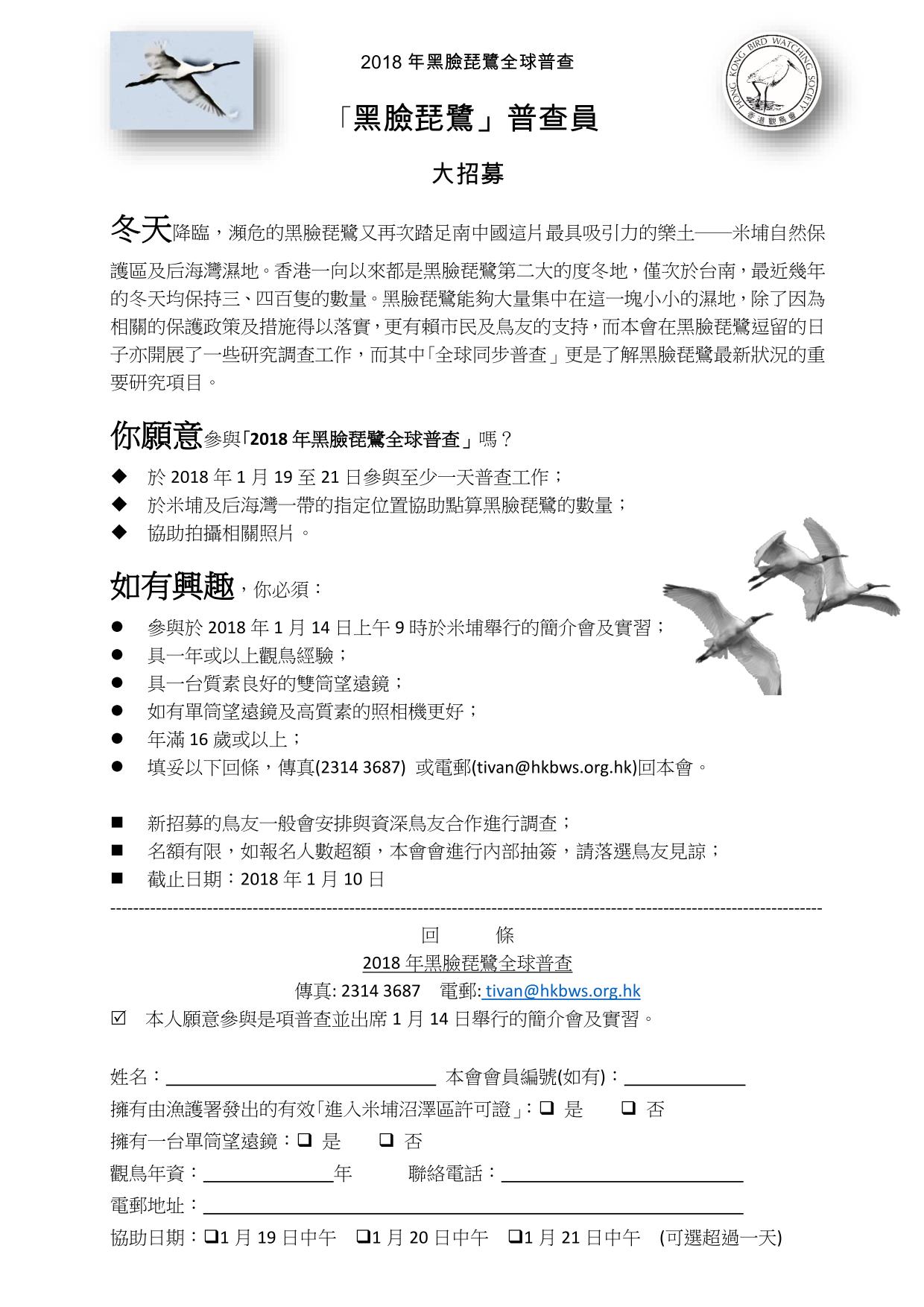 2018年黑臉琵鷺全球普查 Intl BFS Census - 普查員大招募 Recruitment