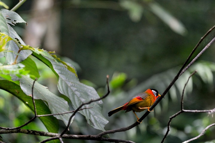 With a black cap that contrast sharply with bright yellow bill and silvery white ear coverts in the shape of a protractor pointing to the eyes, this bird perched on a branch at Tai Po Kau on April 16th. With olive-grey upperparts connect with red wings-patches, the yellow underparts lead to a greyish black tail decorated with dapples of crimson colour, the mesia jumped up and down in the forest. The silver-eared mesia is always a pleasure to watch.