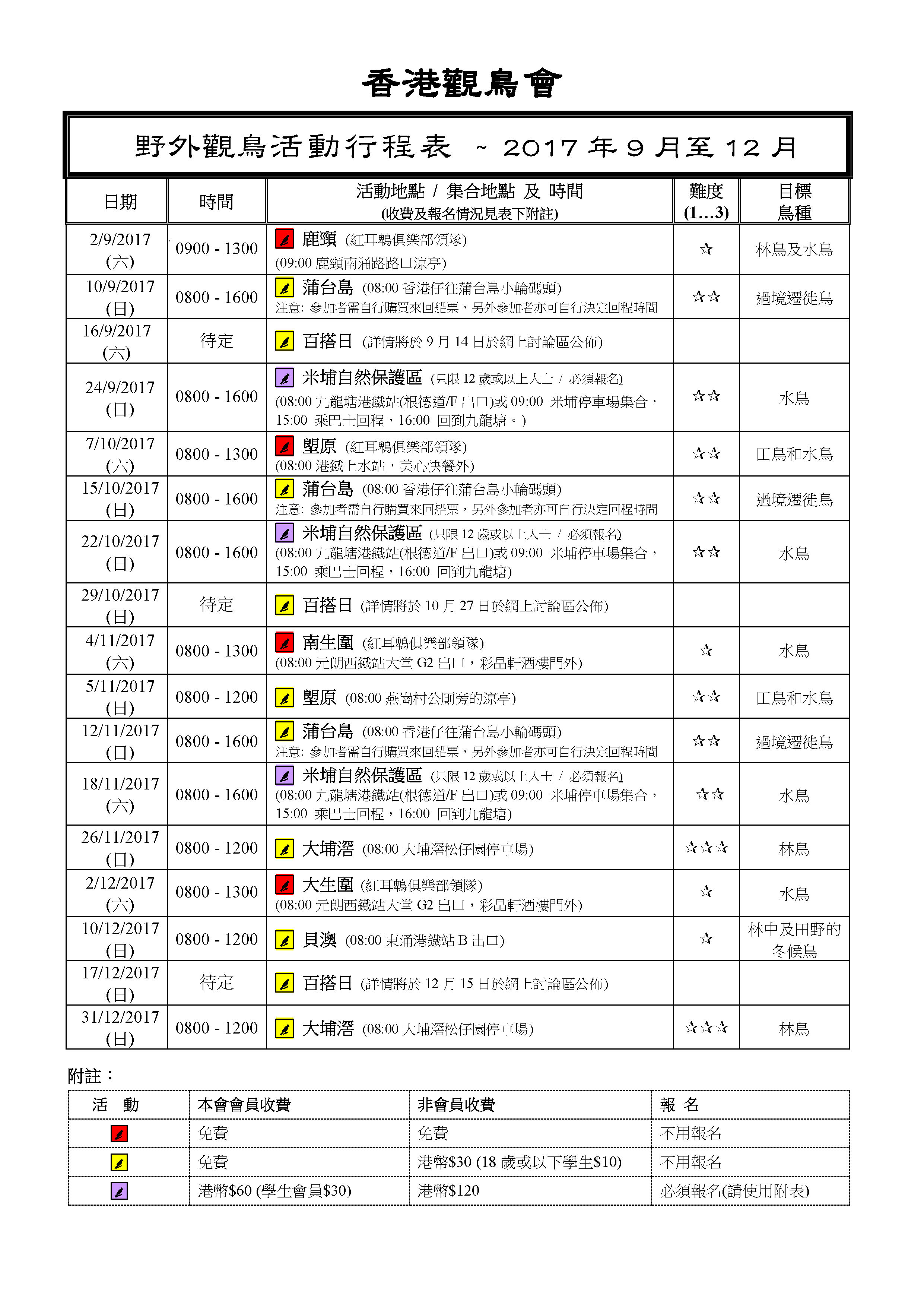 2017年 9-12月戶外觀鳥活動時間表