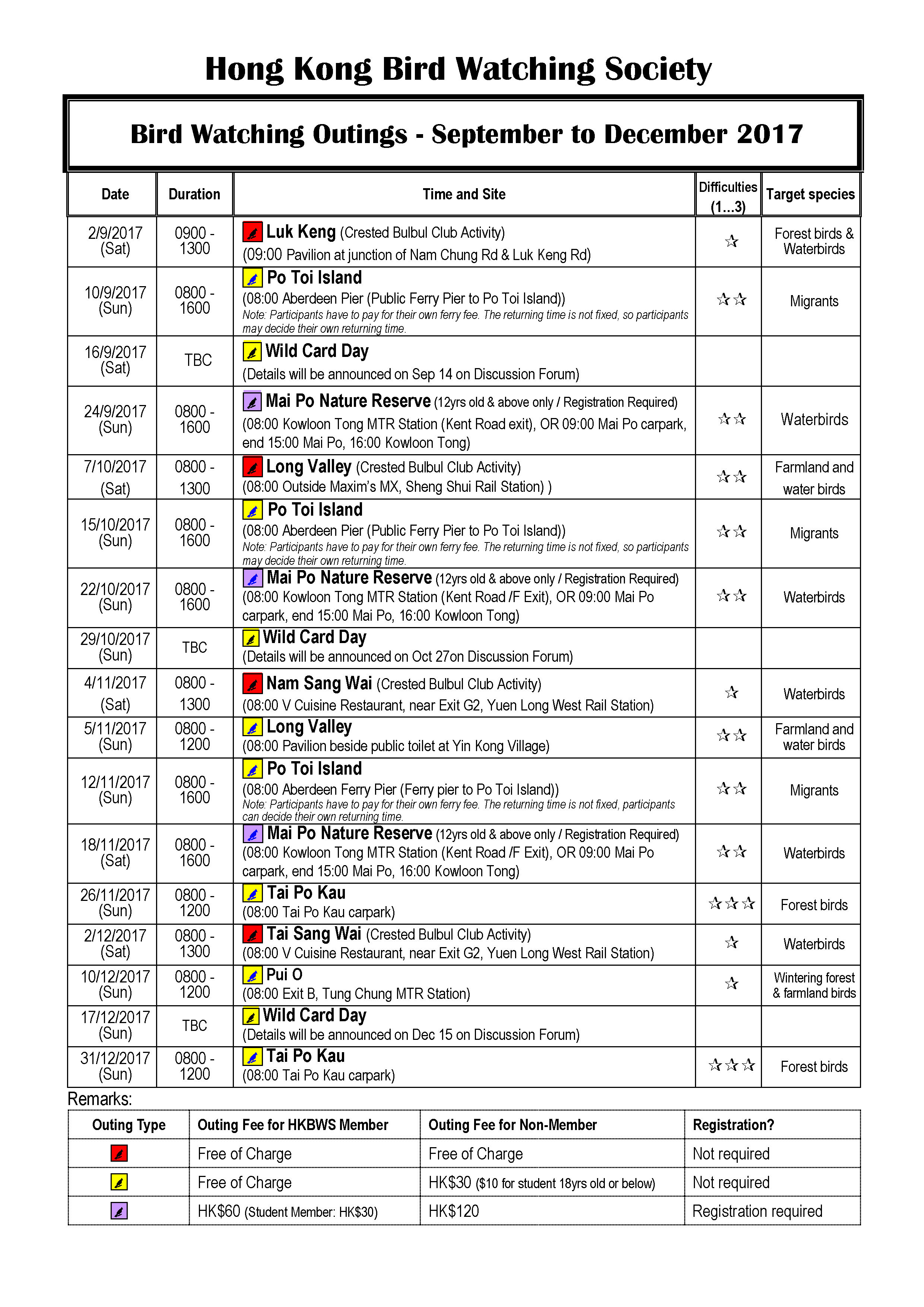 Sep to Dec 2017 Outing Timetable