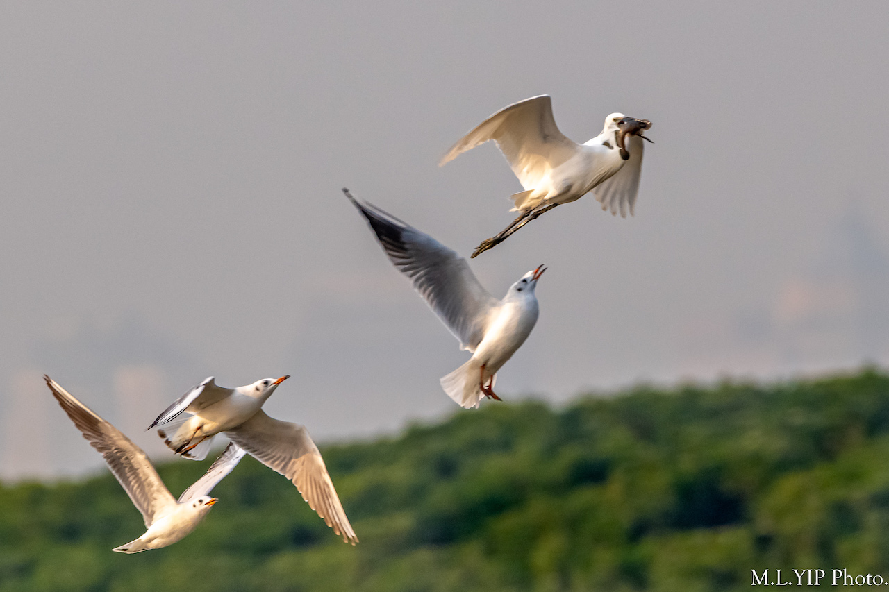 大白鷺捕得小魚, 馬上引來紅咀鷗. 大白鷺拚命爬升, 一面把小魚吞下, 幸好沒有"落錯格".