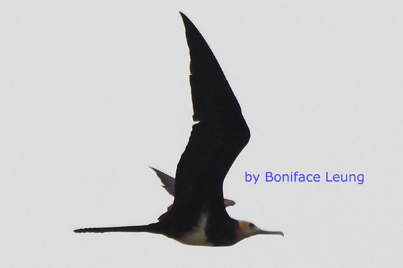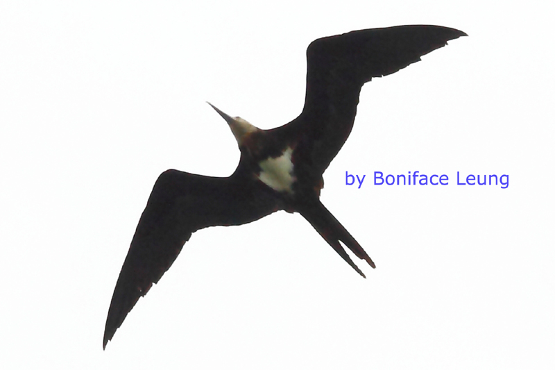 Isn't the pattern of white on the belly more indicative of Christmas Island Frigatebird? (White spurs extending from mid-way along the white area towards the mid-point of the wing, white not extending fully into the wing, white extending broadly as far back as the legs). The late autumn date I think is also more typical of CIF records in Hong Kong