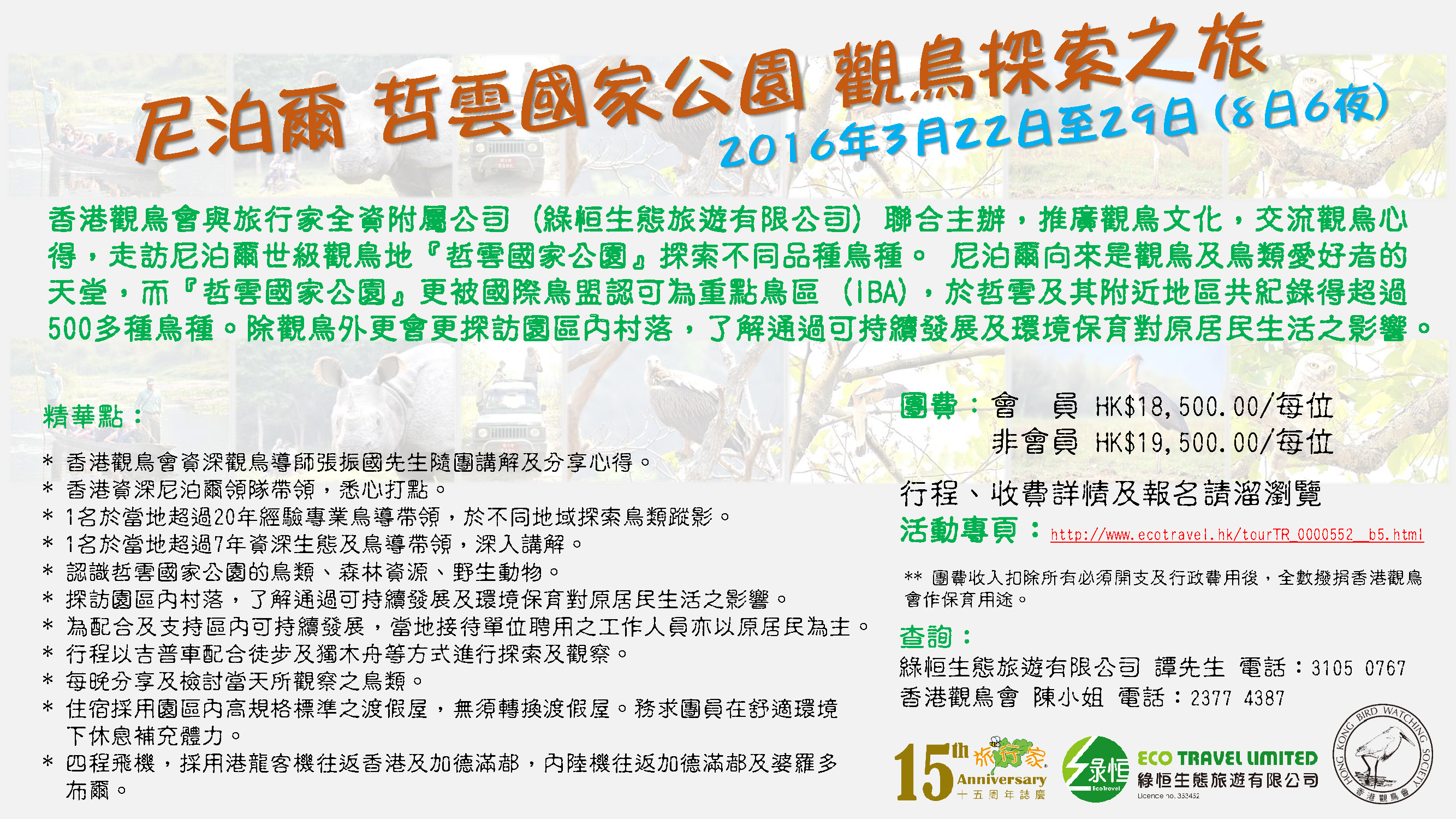 由於近日尼泊爾發生內陸機意外,而尼泊爾哲雲國家公園觀鳥探索之旅包含2程內陸航程,縱本團已確定成行,然而基於參加者安全的理由,本觀鳥團現決定取消。本會合作伙伴綠恒生態旅遊有限公司將聯絡參加者安排退款事宜。