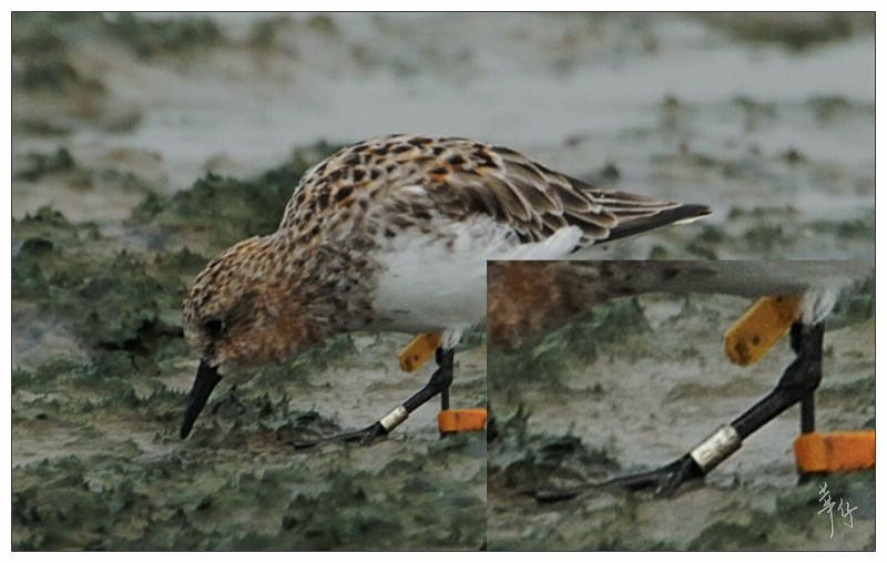Red-necked Stint - orange flag above knee & yellow flag below knee on right leg; no alphanumerical